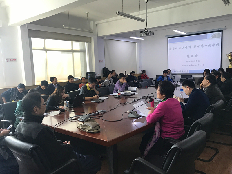 11月1日下午13:30,为了更好地学习贯彻中国共产党第十九次全国代表大会的精神,金融公司党委在公司南路校区主教学楼913会议室召开了“学习党的十九大精神,创世界一流学科”座谈会。365英国上市公司全体教职工参加了本次座谈会,会议由公司党委书记葛仁霞主持。