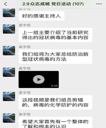本次党日活动采取线上交流的方式进行。在分享之前,支部成员分为了五组,分别从新型冠状病毒的介绍、如何防治新型冠状病毒、新型冠状病毒对经济的影响、新型冠状病毒对社会的影响、抗疫过程中的先进党员事迹五个角度进行学习。线上交流时间为2月9日下午14:00到17:00,共计3个小时。交流过程由分享、回答、总结三个环节构成。本次分享材料形式多样,从文字到视频,体现了小组成员的精心准备。交流过程中维持着良好的秩序,同时又能看到思想碰撞的火花。