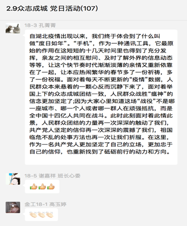 本次的线上交流活动,重在调动党支部成员充分发挥示范带动作用。面对疫情蔓延的严峻形势,只有进一步增强“四个意识”、坚定“四个自信”、做到“两个维护”,切实把思想和行动统一到习近平总书记重要指示精神上来,统一到党中央、国务院、省委省政府、市委市政府、省教育厅对于疫情防控工作的要求上来,才能真正实现“众志成城,共克时艰”,打赢这场没有硝烟的战争。