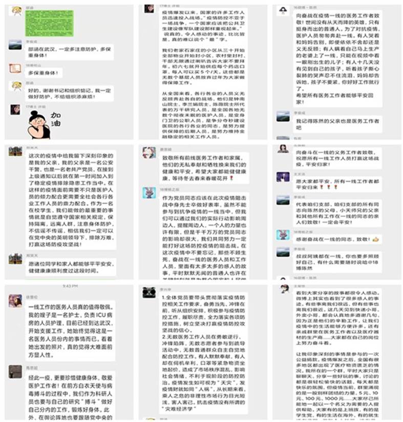 许晗同志、聂婧同志、王棠悠同志、包宏同志和王姝雅同志分享了疫情期间身边发生的点滴故事,进一步感慨到人性的温暖以及中华儿女团结一心,共克艰难的品质。此外李兴申同志,杨之辰同志、魏冬同志、秦秀婷同志、左振颖同志、马思超同志、乔婧媛同志、邱亦霖同志、蔡思颖同志、张霆同志、聂可昱同志和王文洁同志也积极参与会议讨论,向大家分享了自己在疫情期间的所思所感。同志们讨论非常热烈,原定半小时的讨论持续近1个小时。