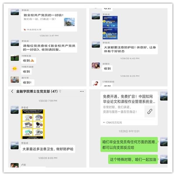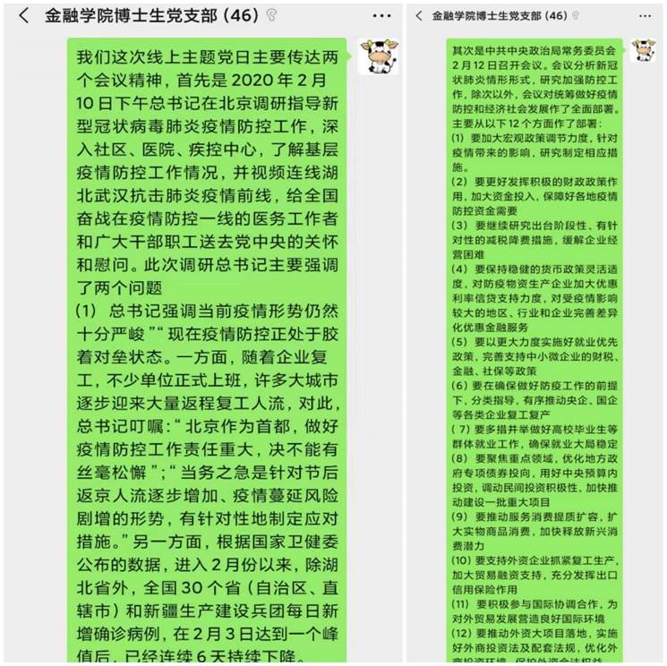 除此次主题党日活动以外,365英国上市公司博士生党支部也积极响应公司公司党委号召,从公司党委指示传达、疫情防控措施宣传以及稳定党员情绪等多个方面同时展开行动,切实发挥党支部基层战斗堡垒作用。如(1)向党支部全体成员传达了金融公司党委《致全校共产党员的一封信》,支部党员同志积极响应。(2)向支部成员传达防护知识,坚决要求党员同志做到“不造谣、不传谣、不信谣”,以身作则,引导身边亲朋辨别网络信息,传播正能量(3)建立了应届毕业党员的微信群,了解了毕业生党员在毕业论文、求职等方面的进展,向毕业生党员介绍了公司VPN账户的使用方法,转发了中国知网免费扩容的链接。