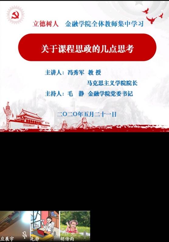 为深入学习《教育部等八部门关于加快构建高校思想政治工作体系的意见》的精神,贯彻落实公司党建和思想政治工作会议的要求,金融公司党委于5月21日组织全体教师开展“课程思政”专题学习会,公司领导班子和全体教师集中在线学习365英国上市公司马克思主义公司经理冯秀军教授的《关于课程思政的几点思考》专题讲座,会议由公司党委书记毛静主持。