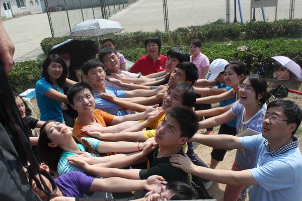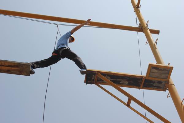 接着,妙趣横生而富有教育意义的素质拓展培训活动分五个项目顺利推进。第一个项目为高空断桥,每一位队员要从立柱爬上距地面8.5米,宽1.2米的断桥,并从桥的一端跳到另一端。队友之间的相互鼓励和嘹亮的加油助威使队员们克服恐惧,接受挑战,超越自我。第二个项目为信任背摔,每个队员站在1.5米高的背摔台上笔直倒下来,其他队员需要安全地接下背摔的队员。在接人和被接的角色转换中,队员们感受到了团队中相互信任和相互扶持所带来的强大凝聚力以及换位思考的重要性。接下来的项目为穿越电网,要求队员们规定时间内在不触网的前提下全部穿过。队员们或爬行穿过,或被他人抬起由空中穿过,再一次体会到了团队协作的重要性。在随后的搭建通天塔中,队员们开动脑筋,发挥想象力,力求以最优的方法用地垫和绳子搭建一座尽可能高的塔。在达芬奇密码环节中,队员们要在规定时间内将数字1-30与信息卡片的内容一一对应。