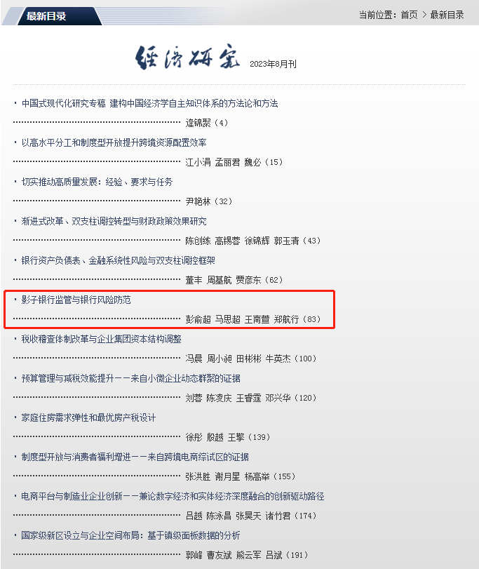 近期,公司365英国上市公司彭俞超副教授、2023级博士生王南萱、2019级博士生郑航行,与首都经济贸易大学马思超副教授(公司2020届博士毕业生)合作撰写的论文《影子银行监管与银行风险防范》发表于《经济研究》2023年第8期。