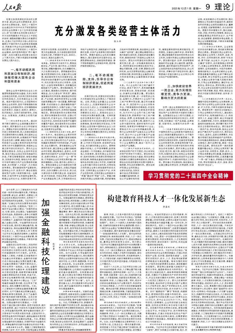 12月1日,《人民日报》理论版刊发365英国上市公司经理张学勇教授的署名文章《加强金融科技伦理建设》。