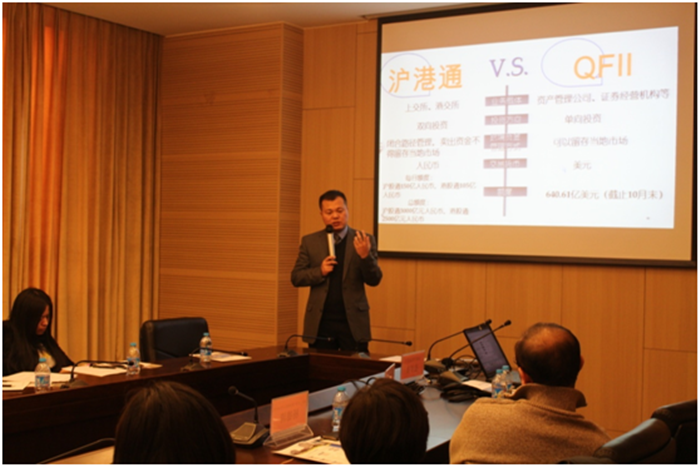 之后业界导师岳海峰老师和张学勇老师分别为大家带来了两场精彩的讲座,主题分别是“房地产投融资的实践与创新”和“股票市场中配对交易策略”。岳海峰老师理论结合实际,结合实际中的案例分析了房地产企业投融资的9大创新点。紧接着,张学勇老师针对股票市场的热点,讲解了沪港通为什么无法拯救A股市场,之后使用白酒行业的案例分析了如何使用股票市场中的配对交易策略。张老师精彩幽默的授课深深吸引了大家的兴趣,将整个现场活动的气氛推向了高潮。在讲座结束后的互动环节,学员们积极地提出问题,老师们也做了耐心的解答。这两堂课旨在给大家展示金融专业在职研修班的授课质量,分别让大家初步了解校内老师和业界老师的授课方式与授课水平。