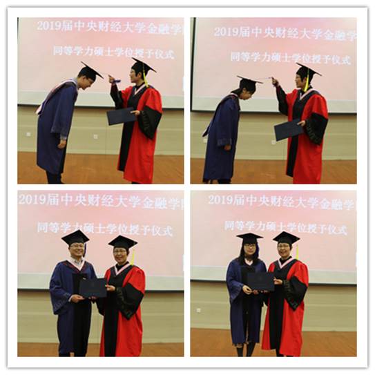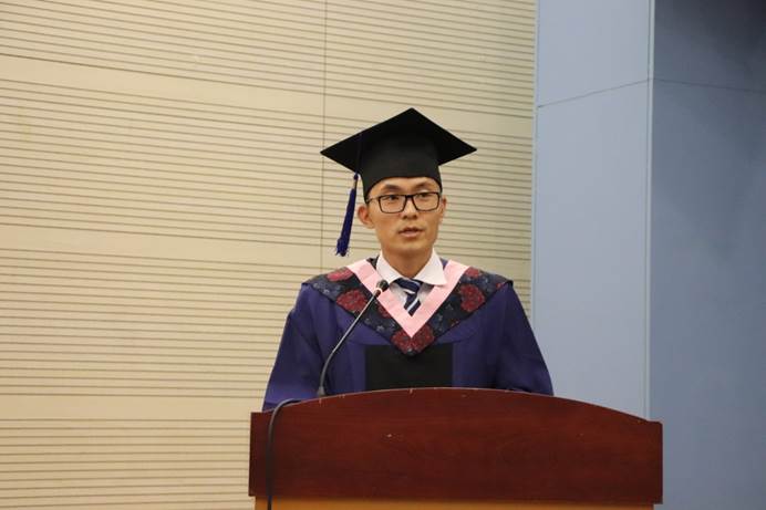 仪式第四项是由董信芳代表此次获学位同学发言。首先他对公司导师的指导和帮助表示真诚的感谢。随后他还带领着大家一起回忆初入学时的种种情景。但斗转星移,很快就到了收获,也是离别的时刻。他认为,在中财学习的日子里,他不仅收获了满满的金融知识,而且还收获了深厚的友情,收获了无悔的未来。