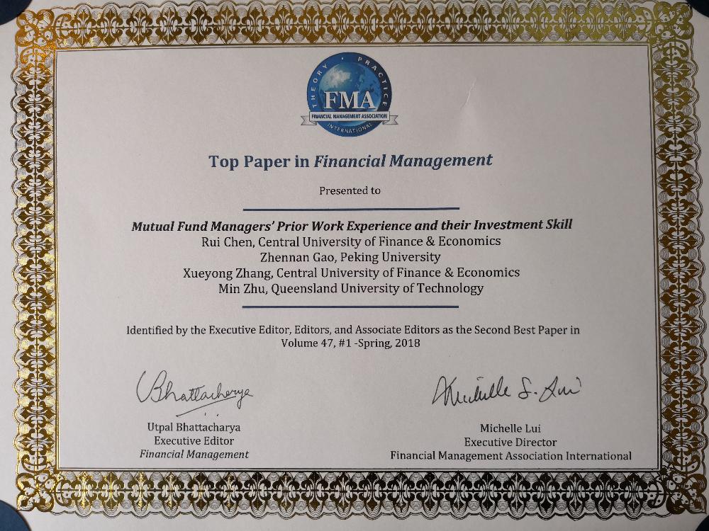 此次获奖论文“Mutual Fund Managers’ Prior Work Experience and Their Investment Skill”发表于学术期刊Financial Management,作者包括公司陈锐副教授、2016届本科毕业生(现北京大学博士生)高震男、张学勇教授、昆士兰大学朱敏副教授(之前在昆士兰科技大学)。此论文主要研究基金经理的前任工作经历对其投资能力的影响,通过手工收集中国共同基金中偏股型和混合型基金的数据,将基金经理的前任工作经历主要划分为两类:宏观分析师和行业分析师。研究发现,那些具有宏观分析师工作经历的基金经理具有显著的择时能力,而行业分析师整体上具有更显著的择股能力。
