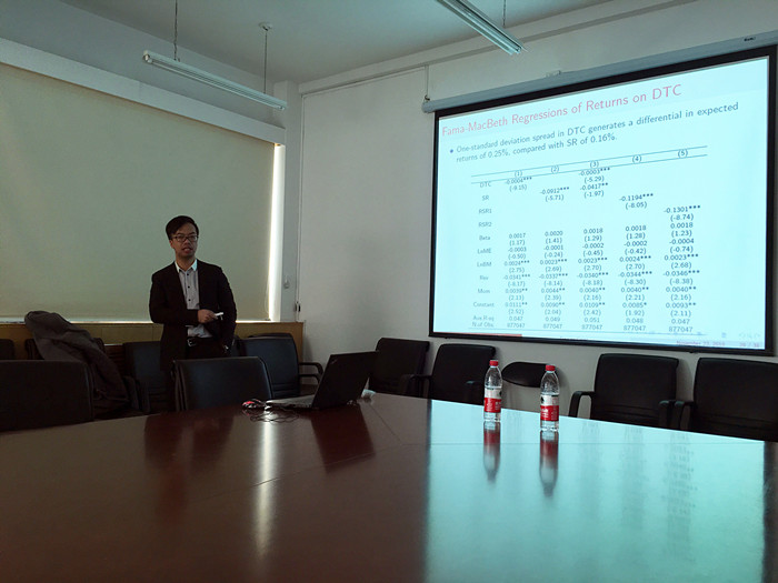 本次研讨会由香港科技大学金融系博士生李伟凯就“空头回补天数和股票收益”为题做了精彩的报告。报告探讨了拥挤交易和卖空背景下的流动性之间的关系,用空头的回补天数DTC作为评判拥挤交易的指标,用日成交量和每日报价价差百分比等五个变量作为流动性的指标。报告认为套利者会减少流动性较差的股票的仓位,并从拥挤交易的仓位获得补偿。同时本报告也研究了拥挤交易对对冲基金持有量的影响,认为高仓位的对冲基金表现要优于低仓位的对冲基金。在报告过程中,老师和同学们提出了多个疑问,李伟凯博士都给出了详细而具有说服力的解释,并与参会人员进行热烈的探讨和交流,使得在场的人员都因本次浓厚的学术氛围而受益良多。