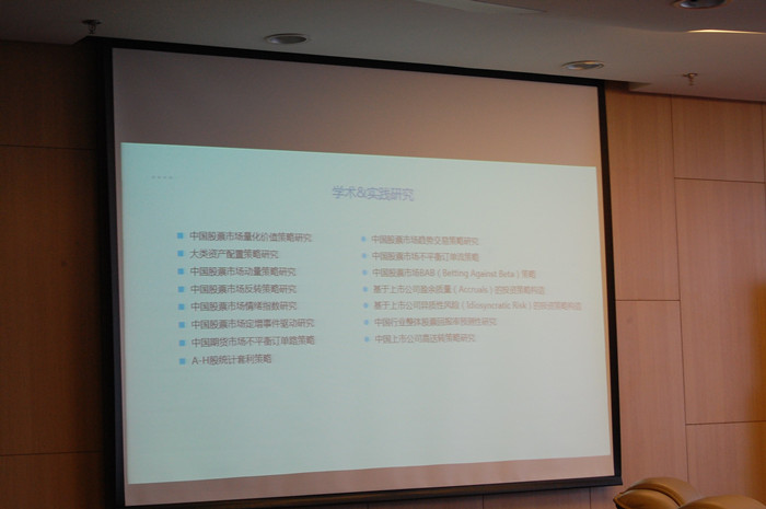 接下来,张学勇教授对中心的情况进行了详细的介绍,主要包括中心的宗旨和使命、研究成员背景、中心成立的前期积累和成果展示及中心未来的研究计划。成立的初衷主要有两点:一是源于多年的学术积累;二是致力于将学术研究更多地与中国资产管理市场实践相结合。中心始终坚信:Knowledge is power,希望中心的发展能够促进学术研究服务于市场,为中国资本市场发展提供有价值的借鉴。