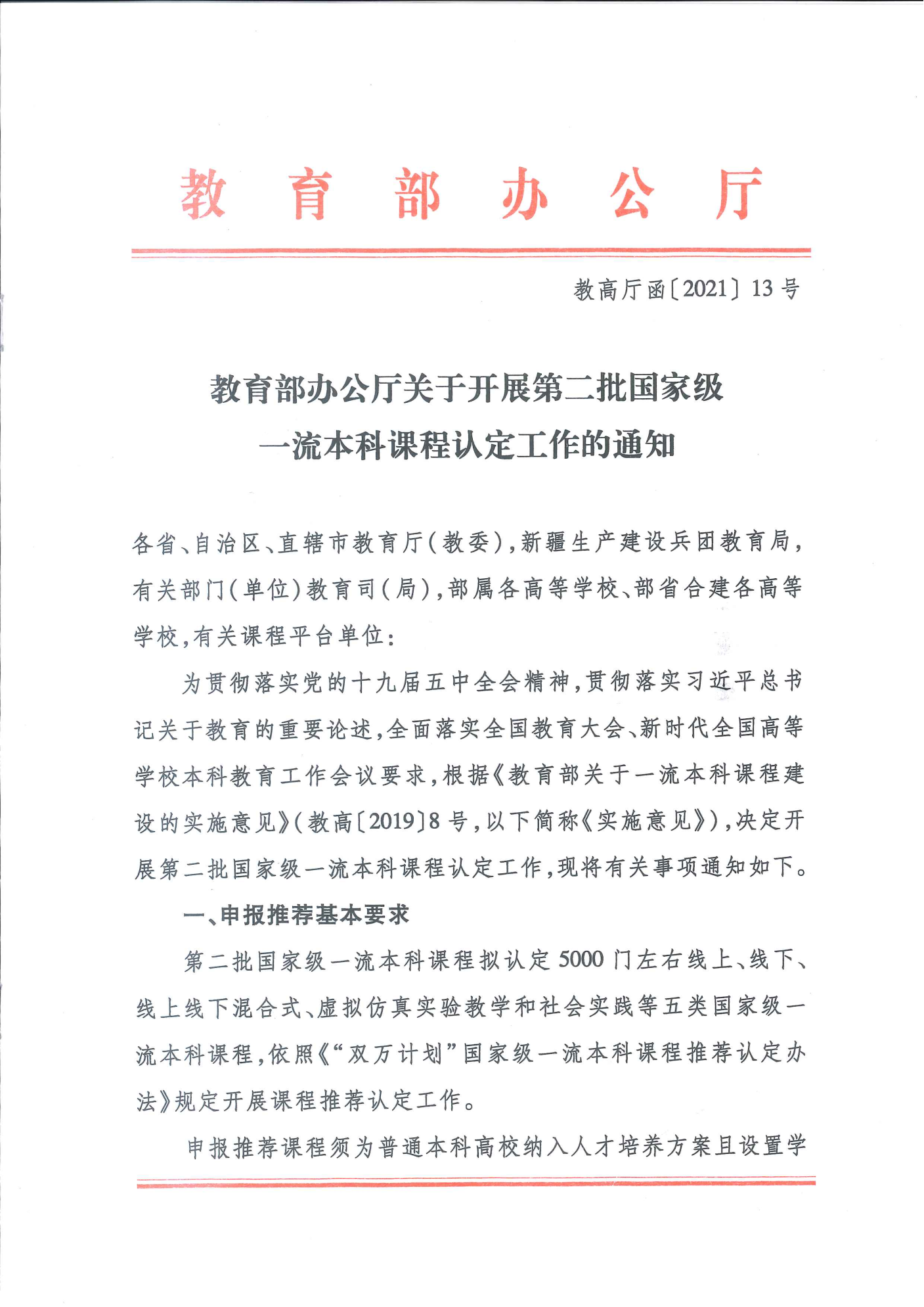 教育部办公厅关于开展第二批国家级一流本科认定的通知
