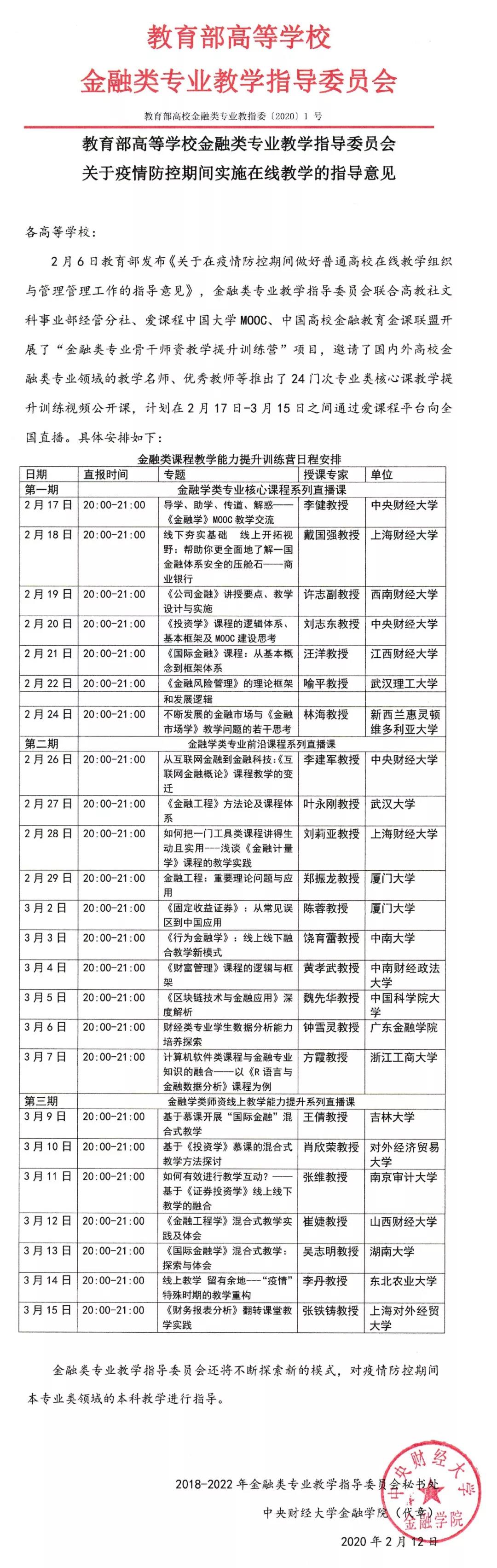 教育部⾼等公司⾦融类专业教学指导委员会关于疫情防控期间实施在线教学的指导意⻅