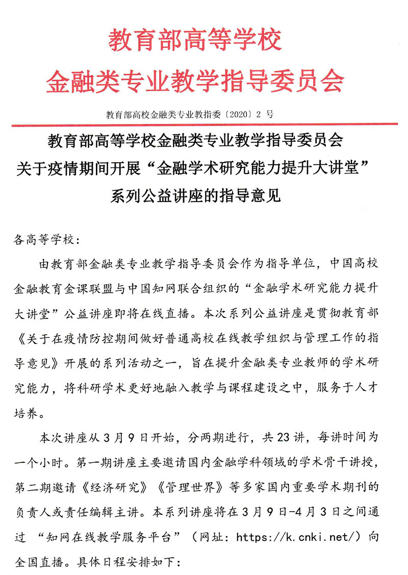 教育部高等公司金融类专业教学指导委员会关于疫情期间开展“金融学术研究能力提升大讲堂”系列公益讲座的指导意见