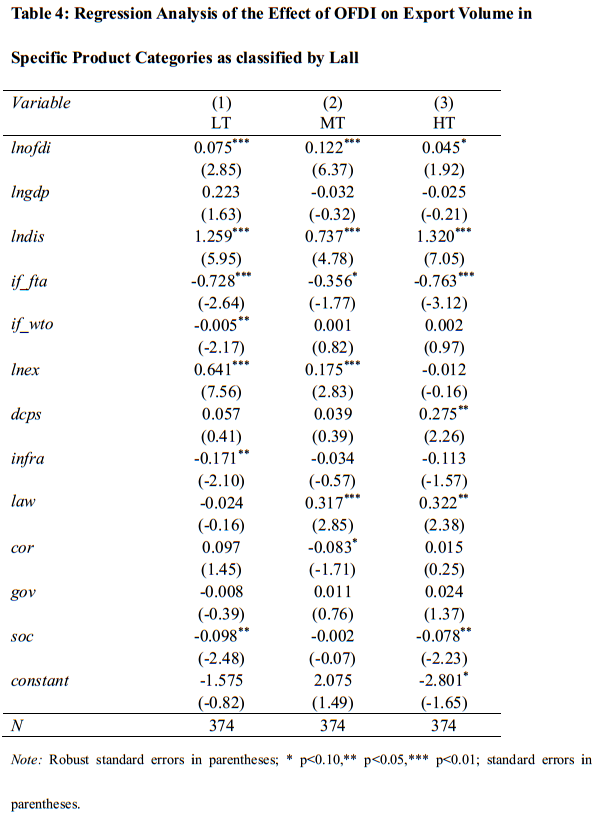 (三)对外直接投资对不同技术含量产品出口量的影响