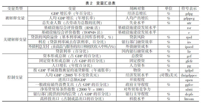 金戈(2012)在测算中国基础设施资本存量时将基础设施投资的统计范围划定在为 “电力、燃气及水的生产和供应业”,“交通运输、仓储和邮政业”,“信息传输、计算机服务与软件业”,“水利、环境和公共设施管理业”四个科目。参考上述范围,并根据数据可得性,本文将基础设施归纳到交通、通信、卫生和能源四个方面。同时,正如Snieska & Simkunaite(2015)所说的那样,研究基础设施投资与经济增长问题很容易遇到数据可得性的问题,如没有完整优质的数据库支持、部分变量数据大量缺失等问题。本文在研究过程中也遇到了该问题,笔者根据现有的数据进行筛选和处理,经筛选后的样本(变量)中的数据经过(前后均值法、模型拟合法和平均增长率法)插值补全少量缺失值和替换异常值(均值±3倍标准差)处理后,进行Winsorize缩尾处理,由此得到平行结构的面板数据。同时,为保证各国数据之间的可比性,本文的指标多采用相对值表示。本文所有数据均来自世界银行的世界发展指标数据库(WDI),数据频率为年度数据,数据期间为2000-2014年。表1、表2展示了各变量的具体定义。
