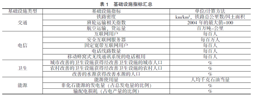 总的来说,近些年关于基础设施的研究在理论和实证两方面都是十分丰富的,其中讨论最多的就是基础设施在促进经济增长等方面的积极作用。在实证方面,已有的研究往往关注基础设施的某一方面,研究如交通、能源或卫生等方面对经济和社会的影响,或者仅仅关注基础设施投资的作用,少有将基础设施各项指标综合进行分析的文献,仅Calderon et al.(2015)基于世界各国总电话线长度、道路里程和发电容量数据,采用主成分分析法构造了一个基础设施综合指数用于评估基础设施建设的发展水平。然而,Calderon等人研究的不足之处在于他们采用的基础设施指标较少,涵盖面较小,反映基础设施建设水平信息量不够;同时,他们采用的基础设施指标为总量数据,总量数据往往受到人口和国土面积的影响,不能直接用于横向比较。此外,虽然有众多研究阐述了亚投行对“一带一路”基础设施建设的重要性,但这些研究仅仅停留在理论层面上,极少有文献运用现实数据对此问题进行实证检验。鉴于此,本文尝试采用更多且更恰当的基础设施指标,采用无量纲和标准化的统计评价方法,构造内涵更丰富、效果更一致的基础设施综合指标,以此来衡量和反映各国各时期的基础设施建设和发展的综合水平,实证研究基础设施建设的综合发展速度与经济发展的关系,进而检验金融要素对基础设施建设水平的影响。