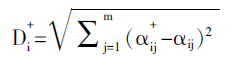 3.分别计算各个评价对象i与最优方案及最劣方案的距离Di+和Di-: