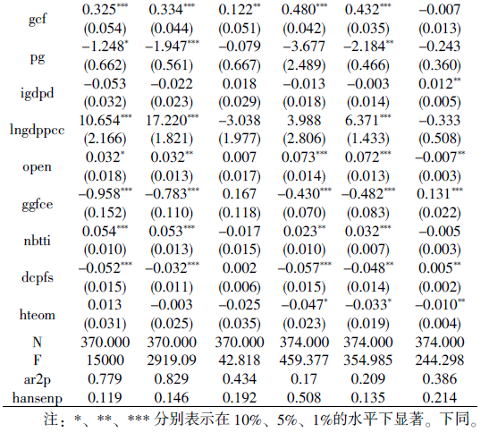 考虑到本文的模型中出现了滞后被解释变量,面板数据模型最常用的固定效应模型和随机效应模型已不能保证得出无偏的参数估计,因此本文采用两阶段一阶差分广义矩估计法(D-GMM)来消除自回归中的内生性的影响。鉴于各经济体类型之间的差异性,模型极有可能存在异方差,故选用Hansen检验来判断过度识别与否。从F_p、ar2p和Hansenp来看,不存在二阶自相关问题和过度识别问题。回归结果显示,基础设施代理变量rsr_gr和c_gr的当期值、滞后一阶和滞后二阶项的系数对GDP增长率和人均GDP增长率均显著为正,对失业率均显著为负,表明基础设施发展对经济增长、居民生活水平的提高和减少失业有着显著的持续性的积极效果。