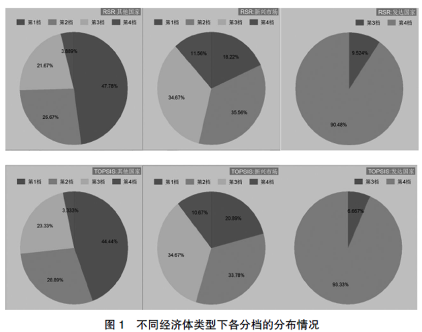 本文按照四分位点分别将RSR和C值分为4档,将2000-2014年按照每5年1期分为3期,把国家按照经济发展状况分为3类。从RSR和C各档在时间上和国家上分布的一致情况和符合直觉的程度来判断两个评价指标的效果。其中,经济体类型的分类参考IMF的《世界经济展望2012》,使用的国家和分类如下表所示。
