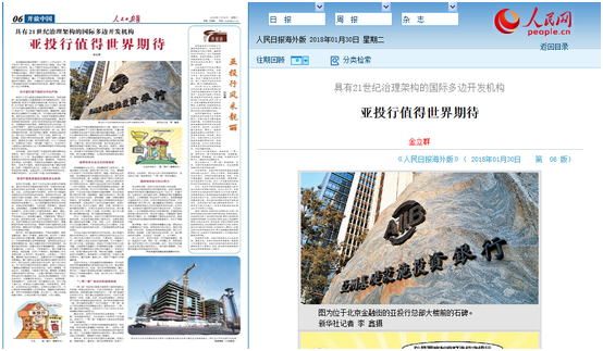 4. 2018年1月30日,亚投行行长金立群在《人民日报海外版》发表署名文章《亚投行值得世界期待》。文中,金立群行长对亚投行成立两年来所取得的成绩进行了总结和肯定,并对2018年的发展方向做出了规划。他指出:进入2018年,亚投行将进一步完善制度建设,落实、检查执行力度。同时,进一步招聘人员,特别是加强一线开发项目工作人员的招聘。此外,项目开发的重点会放在我们独立做的项目上,域内域外要兼顾,并且要开始建立项目效益的评价体系。