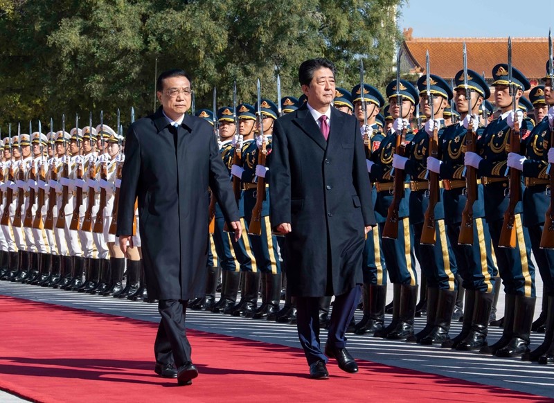 1.2018年10月25日,国务院总理李克强在人民大会堂与对华进行正式访问的日本首相安倍晋三共同出席纪念中日和平友好条约缔结40周年招待会并致辞。