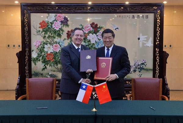 6.2018年11月2日,国家发改委主任何立峰与智利外长安普埃罗在京举行会谈,双方就中智共建“一带一路”合作交流意见。会后,双方签署《中华人民共和国政府与智利共和国政府关于共同推进丝绸之路经济带和21世纪海上丝绸之路建设的谅解备忘录》。