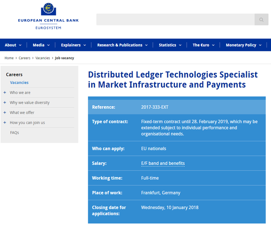 5. 2017年12月21日,欧洲央行官网放出职位招聘市场基础设施建设及支付方面的专门人才,主要负责分布式账本技术(DLT)的相关工作。这一职位的工资是年薪8万欧元,倾向于女性,工作地点在德国法兰克福,不过,只面向欧盟成员国公民开放。