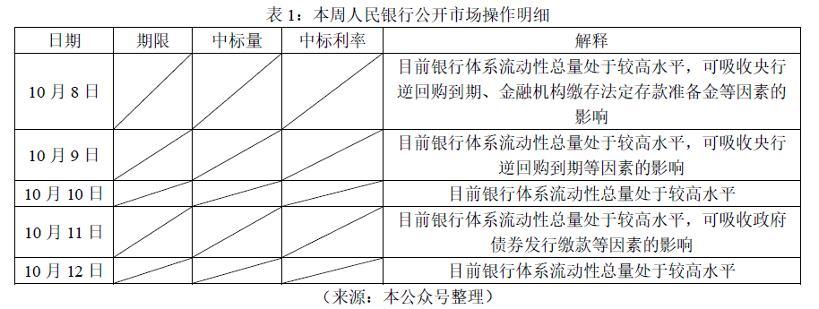1. 2018年10月8日到10月12日,人民银行未进行公开市场业务操作,具体表1所示。