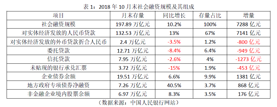 1.2018年11月13日,中国人民银行发布2018年10月末的社会融资规模数据,具体如表1所示。