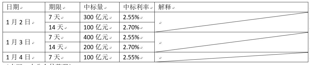 1.2019年1月2日到1月4日,人民银行进行了多笔公开市场业务操作,具体表1所示。