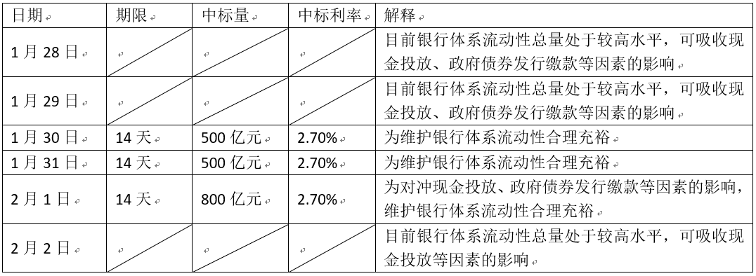 4.2019年1月28日到2月2日,人民银行进行了多笔公开市场业务操作,具体表1所示。