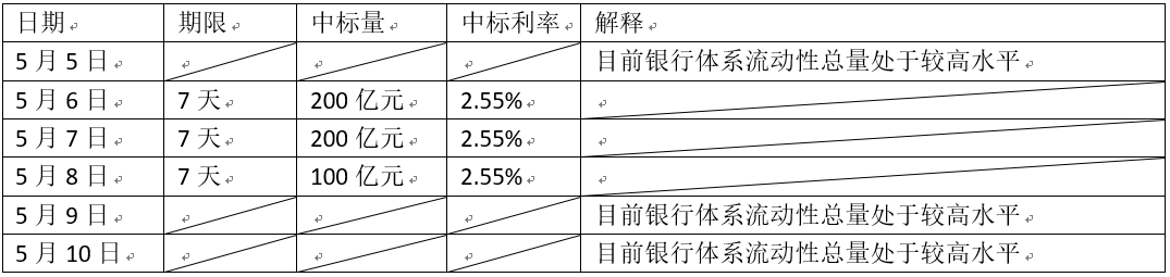 4.2019年5月5日到5月10日,人民银行进行了多笔公开市场业务操作,具体表3所示。