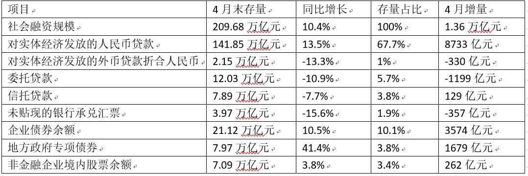 1.2019年5月9日,中国人民银行发布2019年4月末的社会融资规模数据,具体如表1所示。