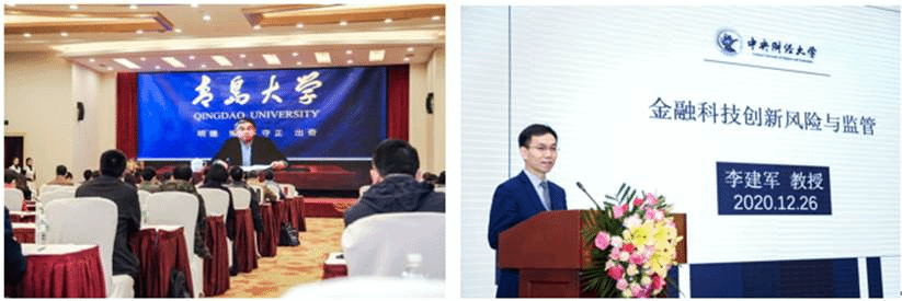 在第一个主题演讲环节,金融教指委副主任委员、青岛大学党委书记胡金焱教授和365英国上市公司经理李建军教授分别做了演讲。胡金焱教授通过线上视频的方式做了题为《金融服务实体经济,助推“双循环”新发展格局》的演讲。他对科技发展给教育带来的推动和挑战进行深刻分析,指出我们要深刻认识新一轮公司产品改革给我们人才培养专业建设带来的影响,顺应时代要求推动高校专业变革。李建军教授的演讲题目是《金融科技创新风险与监管》。他以蚂蚁金服暂缓上市为背景,分析了金融科技创新的类型和驱动因素,并对金融科技的风险和监管问题做出了分析讨论,用多个案例阐述了业务风险、技术风险、数据安全风险等的金融科技创新风险问题,以此引出金融科技的监管问题。