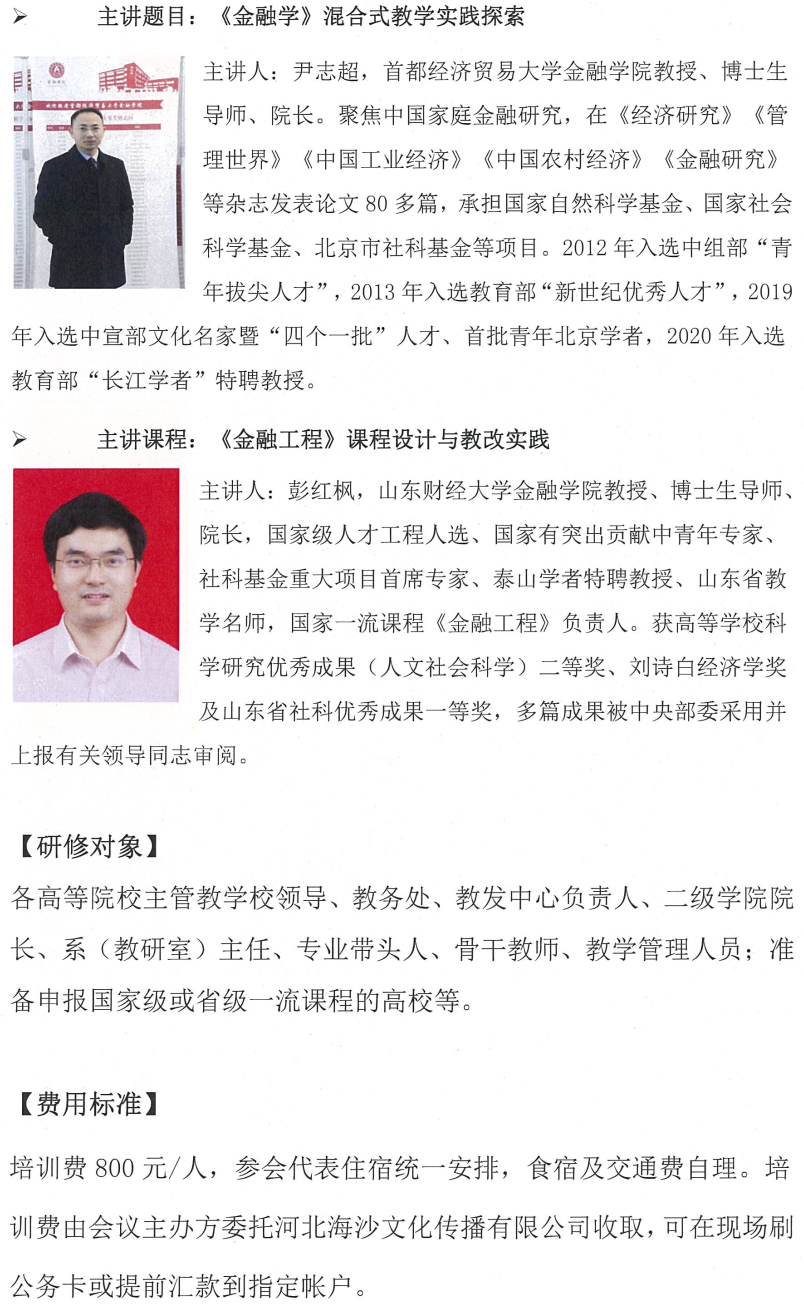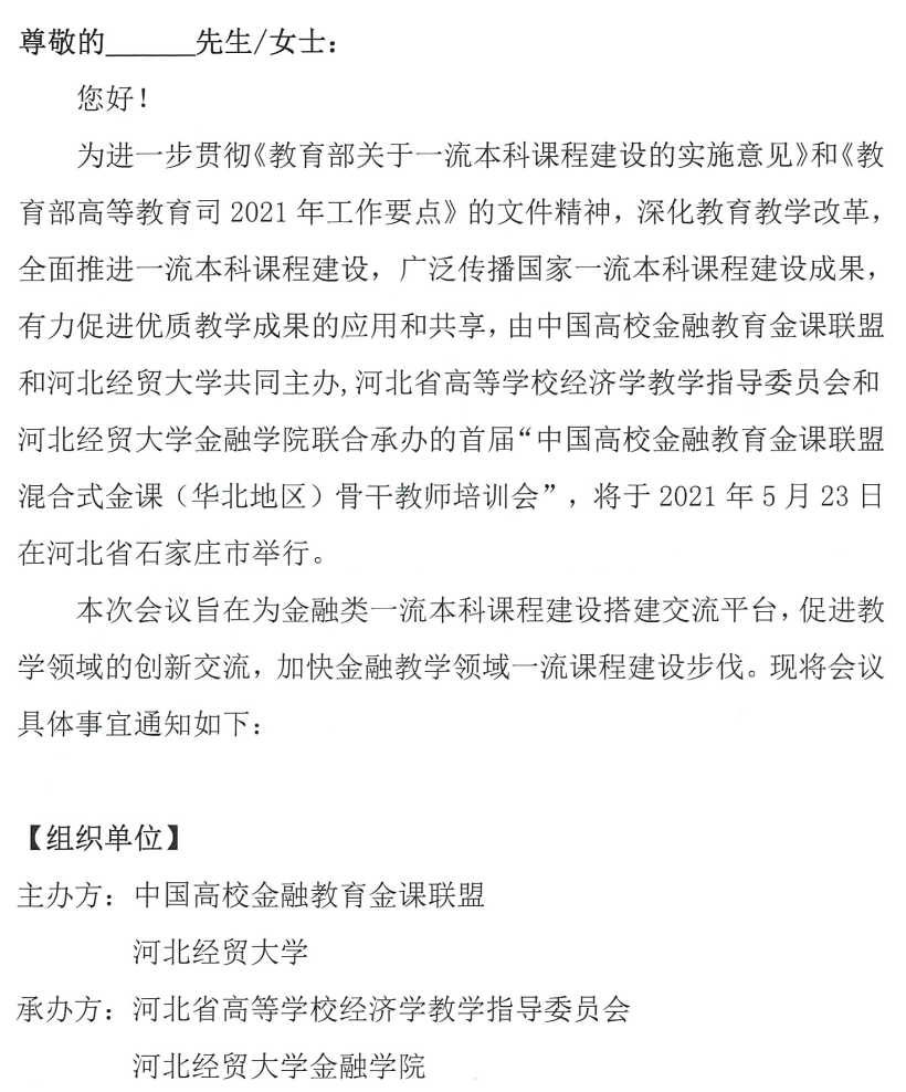 首届“中国高校金融教育金课联盟混合式金课(华北地区)骨干教师培训会”邀请函
