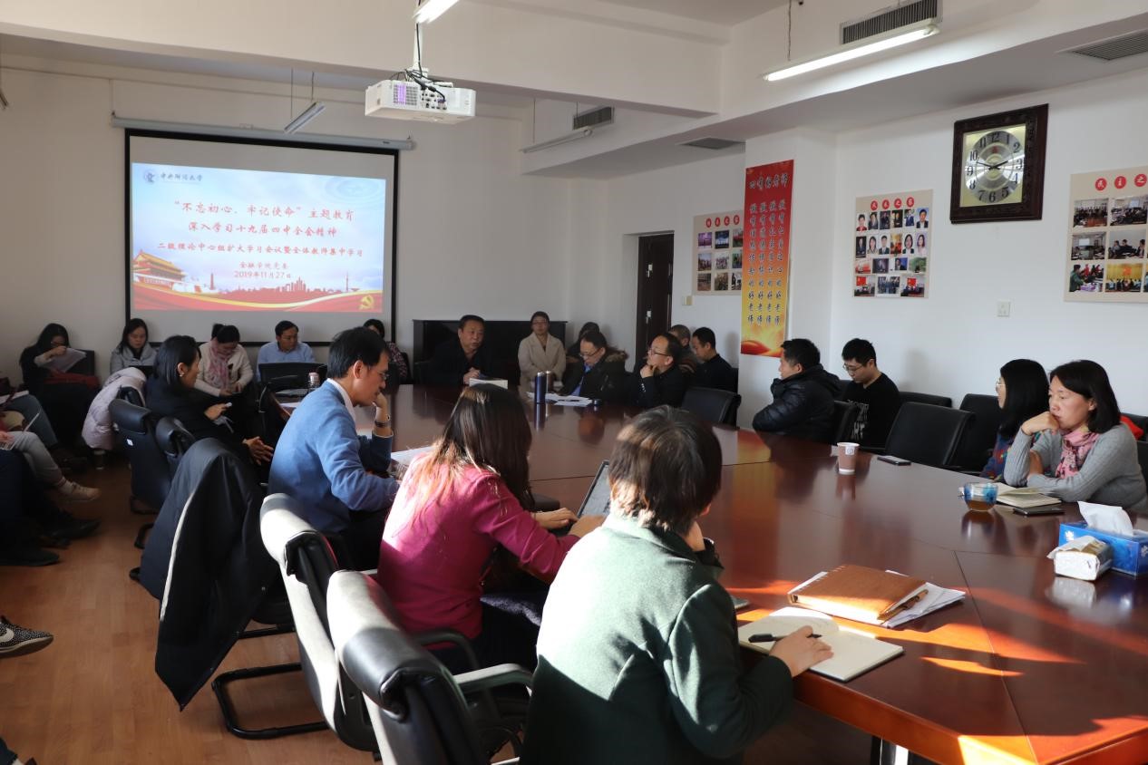 学习好、宣传好、贯彻好党的十九届四中全会精神,是当前和今后一个时期内全国上下的重大政治任务,是高校基层党组织的重大政治责任。结合“不忘初心、牢记使命”主题教育,为切实抓好党的十九届四中全会精神的学习宣传和贯彻落实,公司党委于2019年11月27日组织召开了学习贯彻党的十九届四中全会精神专题研讨会。会议由公司党委副书记李俊峰主持,党委书记毛静,经理李建军,组织员张晓红,副经理应展宇、王辉、黄志刚及公司全体教师参加学习。