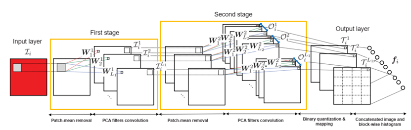 本文使用模型为PCANet模型,遵循CNN的思路,但卷积核使用主成分分析核来组成,非线性层使用哈希算法,最后的特征使用直方图统计来完成。