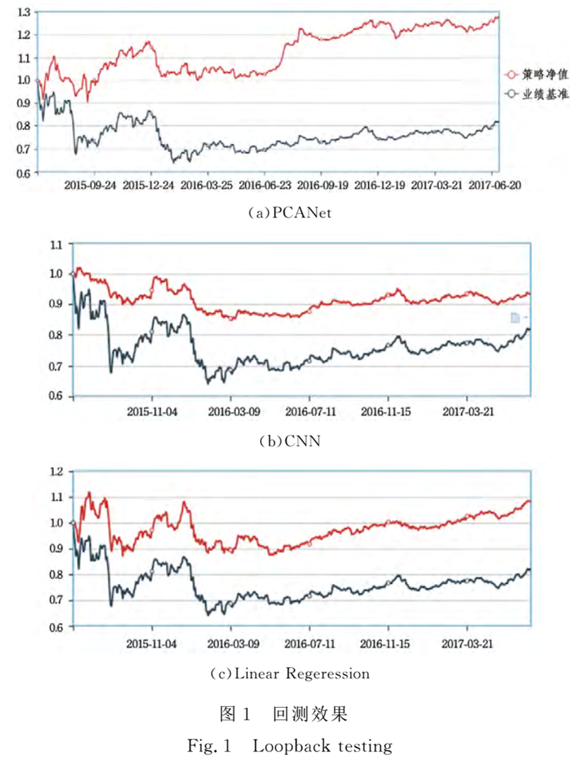 为了评价PCANet策略的选股表现,我们使用PCANet和CNN对训练集的数据价PCANet策略的选股表现,我们使用PCANet和CNN对训练集的数据价PCANet策略的选股表现,我们使用PCANet和CNN对训练集的数据为了评价PCANet策略的选股 表现,我们使用了PCANet和CNN对训练集的数据进行训练,使用了线性回归模型对训练集的数据进行回归。将3种模型在WindQuant平台上进行回测,基准设置为沪深300股指,在时间段2015-07-01至2017-06-30两年的时间进行了选股回测。由于PCANet和CNN均可输出每个分类的概率,根据输出结果的上涨概率,比较选取上涨概率排名前十的股票构成组合。对于线性回归模型,选取预测超额收益 收益率最高的前十股票构成组合。换仓方面,在每个自然月的最后一个交易日核算因子值,卖掉当月所持有的10只股票;在下个自然月的首个交易日按照收盘价买入预测的十只股票进行换仓,每个股票设置等权重调仓。具体的回测结果如下所示