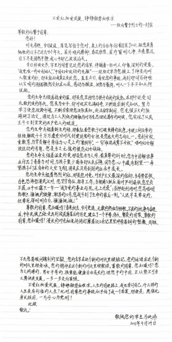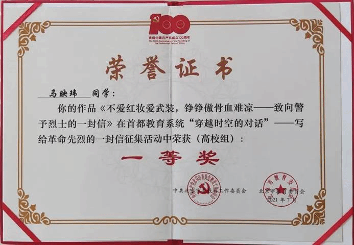 7月15日,由北京市委教育工委、市教委主办的“穿越时空的对话——写给革命先烈的一封信”征集活动颁奖典礼在清华大学附属中学举行。公司2019级本科生马映玮的作品《不爱红妆爱武装,铮铮傲骨血难凉——致向警予烈士的一封信》从1200余所公司1875篇入围优秀稿件中脱颖而出,喜获高校组一等奖。