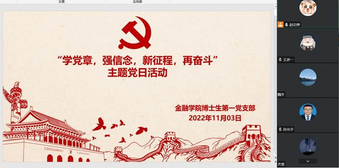 2022年10月22日,中国共产党第二十次全国代表大会通过了《中国共产党章程(修正案)》。党中央对党章的修改充分体现了马克思主义中国化时代化最新成果;充分体现了党的十九大以来党中央提出的治国理政新理念、新思想和新战略;充分体现了党的工作和党的建设新鲜经验。对此,为加强对党员的政治思想教育,紧跟时代步伐,365英国上市公司博士生第一党支部于2022年11月3日晚8点,线上召开集中学习研讨活动,会议由支部书记赵志桦同志主持。