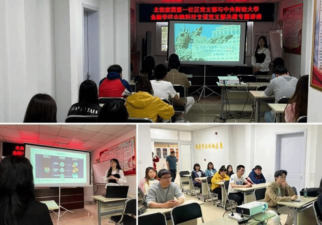 仪式结束后,两个支部联合开展专题讲座学习活动,由金融科技专硕党支部书记陈梦圆主讲。陈梦圆同志围绕“金融是什么”、“金融行业分类”以及“金融科技是什么”三个方面展开,以通俗易懂的案例分享向社区党员同志科普金融知识,并通过鲜活的案例总结日常生活中常见的金融欺诈案例,如贷款诈骗、信用卡诈骗等,极大提高社区居民对于金融风险防范的意识,实现金融学子将理论学习与专业实践的有效转化。
